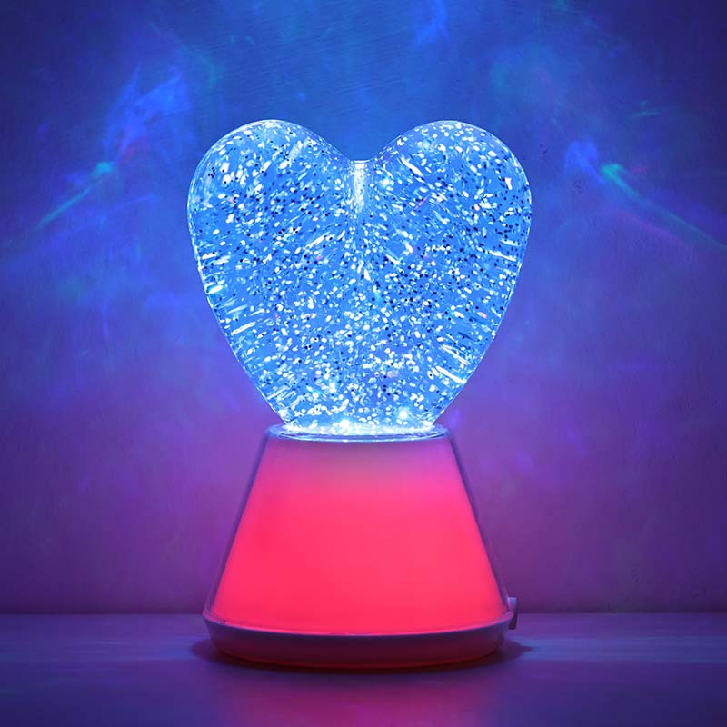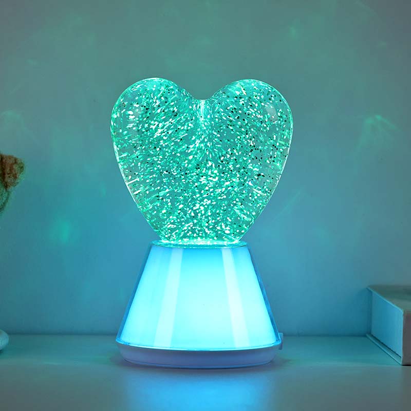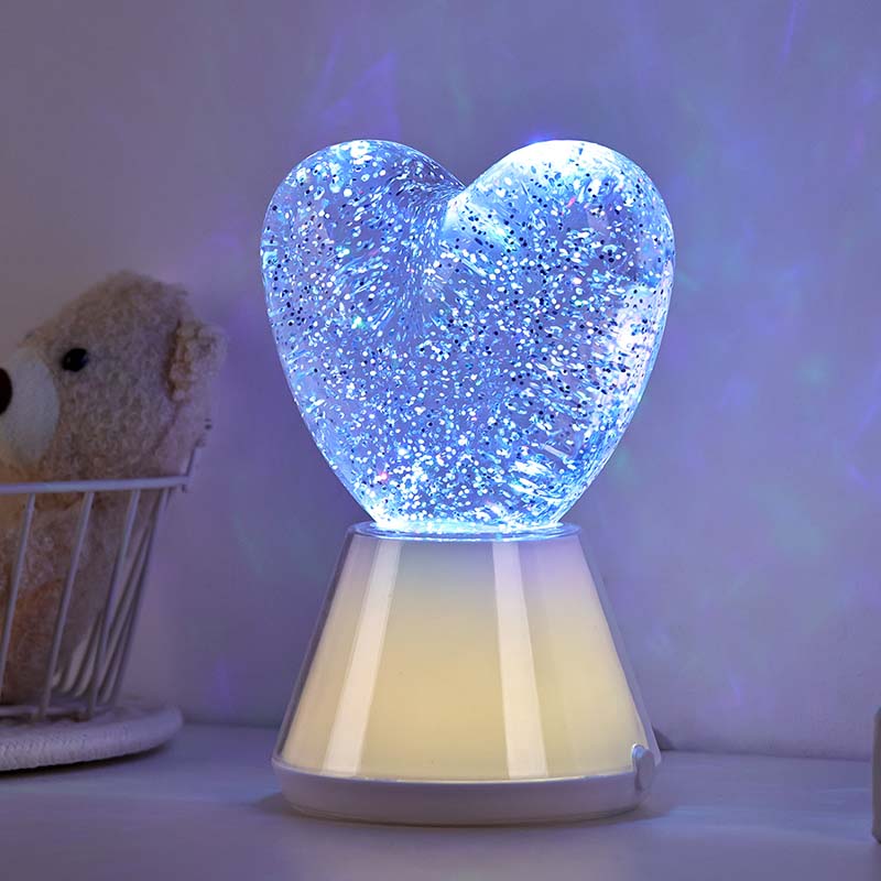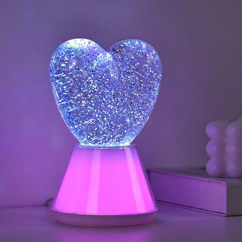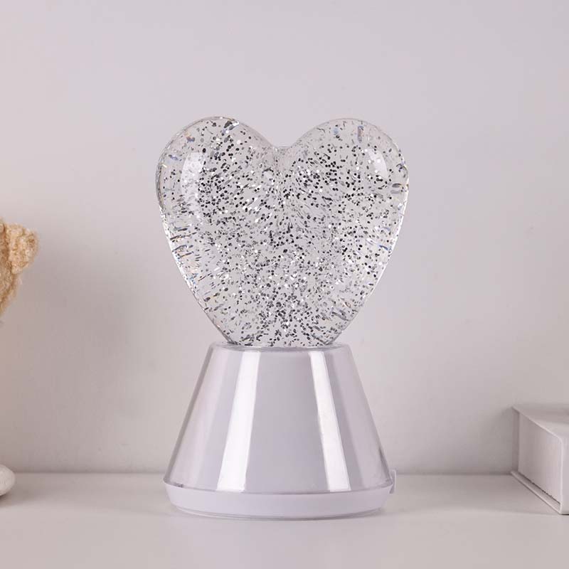 Променяща цвета течна бляскава нощна лампа със сърцевиден нюанс. включва изящна стъклена топка, пълна с мистериозна течност, в която плуват блестящи пайети. По чудо, променяща цвета течна бляскава нощна лампа със сърцевиден нюанс сякаш танцува във вълшебен свят.