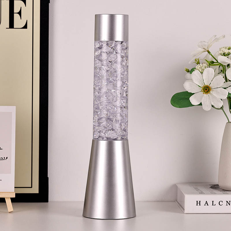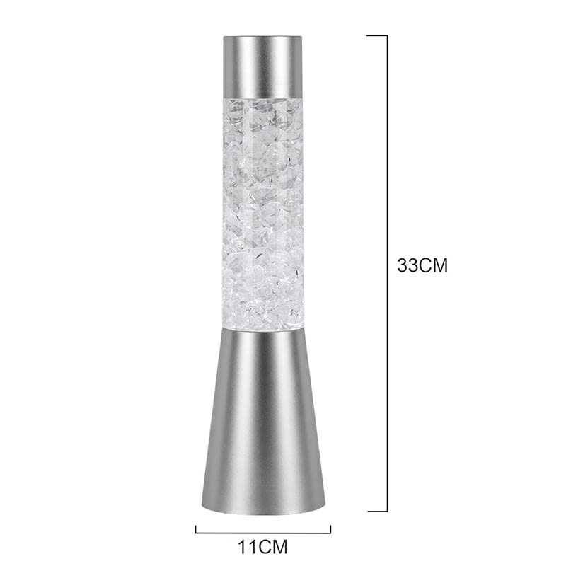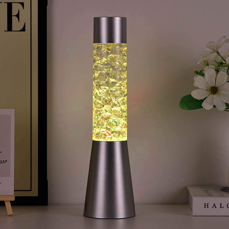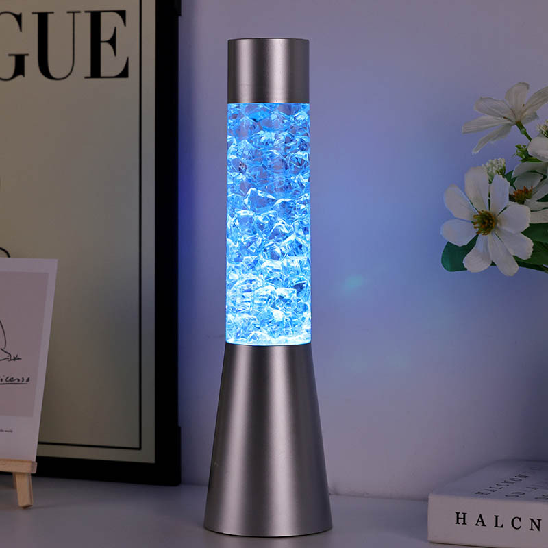 Променящата цвета течна бляскава нощна лампа с ледена форма се отличава с елегантен и модерен дизайн с метална основа и прозрачна горна част, пълна с цветни, подобни на кристали части. Основата на лампата е проектирана да бъде стабилна и елегантна, като допълва всеки стил на домашен декор. Прозрачната част съдържа цветните части, които се движат нежно, създавайки хипнотизиращ визуален ефект. Лампата се предлага в три различни цветови варианта – червено, синьо и зелено – което ви позволява да изберете перфектния нюанс, който пасва на вашия интериорен декор.