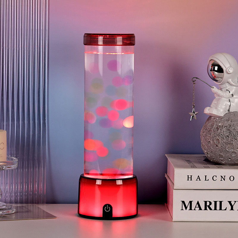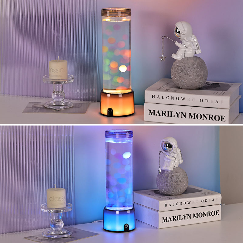 Изработена с внимание към детайла, тази лампа имитира външния вид на истински аквариум с прозрачното си цилиндрично тяло, пълно с прозрачна течност и светещи фигури на медузи, които се носят грациозно вътре. Мекото сияние от вътрешната LED система подобрява движението на медузите, създавайки завладяващ боке ефект, който прилича на биолуминесцентни същества, носещи се в дълбоки води. Независимо дали е поставена на нощно шкафче, бюро, рафт или холна маса, тази лампа добавя нотка елегантност и чудо към всяка среда.