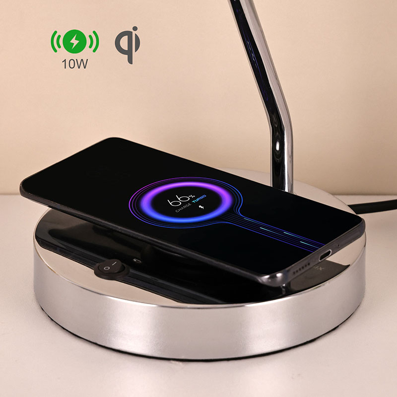 Настолна лампа с безжично зарядно има бутон за включване/изключване на основата