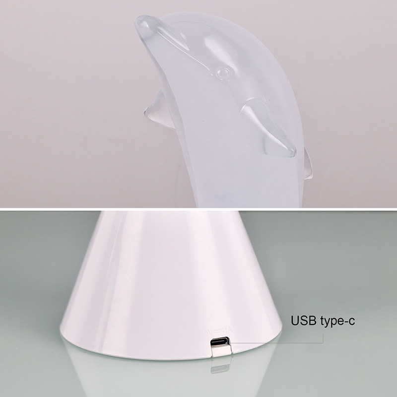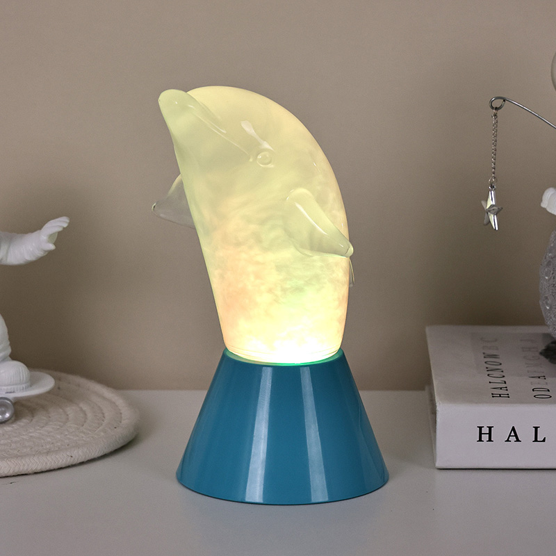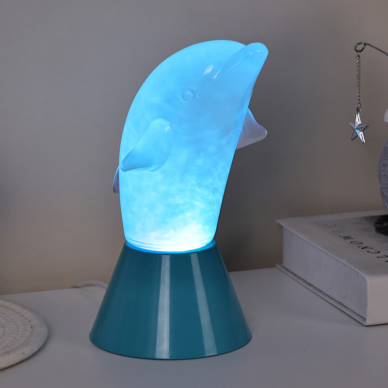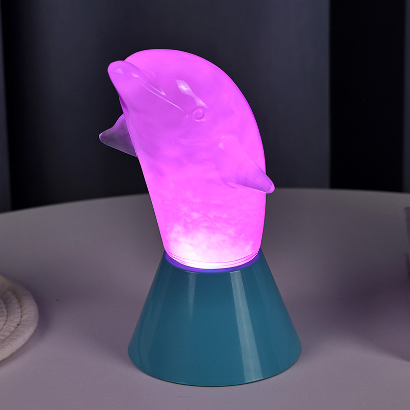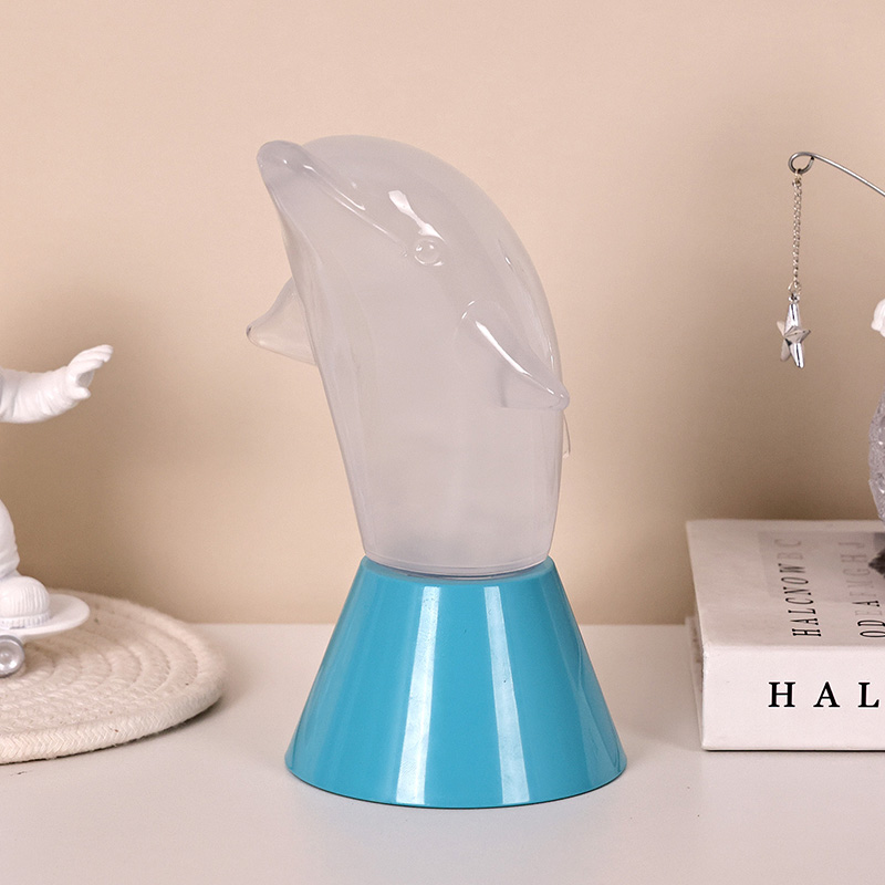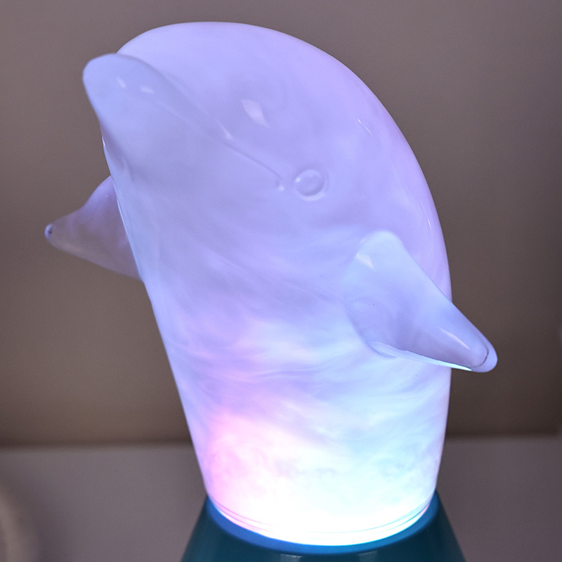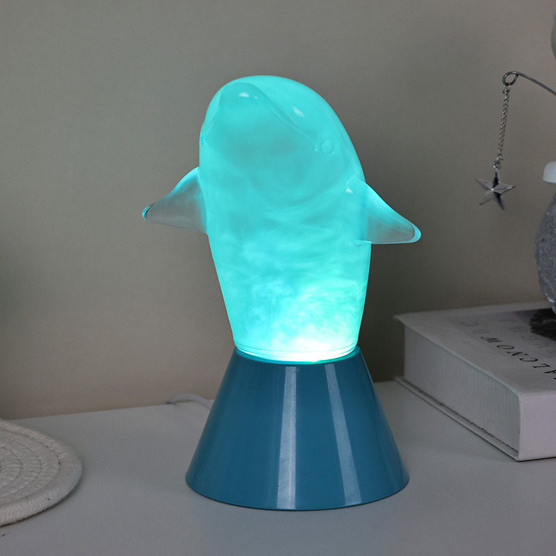 Dolphin Kid RGB Nigh Light е проектиран във формата на сладко делфинче, с плавни линии и изящни детайли, възстановяващи перфектно пъргавата стойка на делфините. Вътре в прозрачната черупка на делфините мъгливо течащата течност прилича на вълни в океана, леко се люлеят, създавайки спокойна и мистериозна атмосфера. Всеки път, когато погледнете тази лампа, ви се струва, че сте в дълбините на океана, изживявайки безкрайното очарование на природата