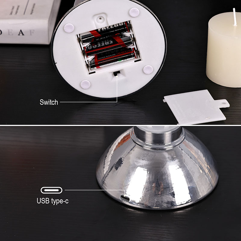 3ААА батерияДекоративната свещ в европейски стил е изработена от метал и пластмаса, като горната и долната част са направени от метал. Горната част може да побере обичайно използвани свещи за осветление, а средната част е проектирана в европейски стил във формата на кратуна.