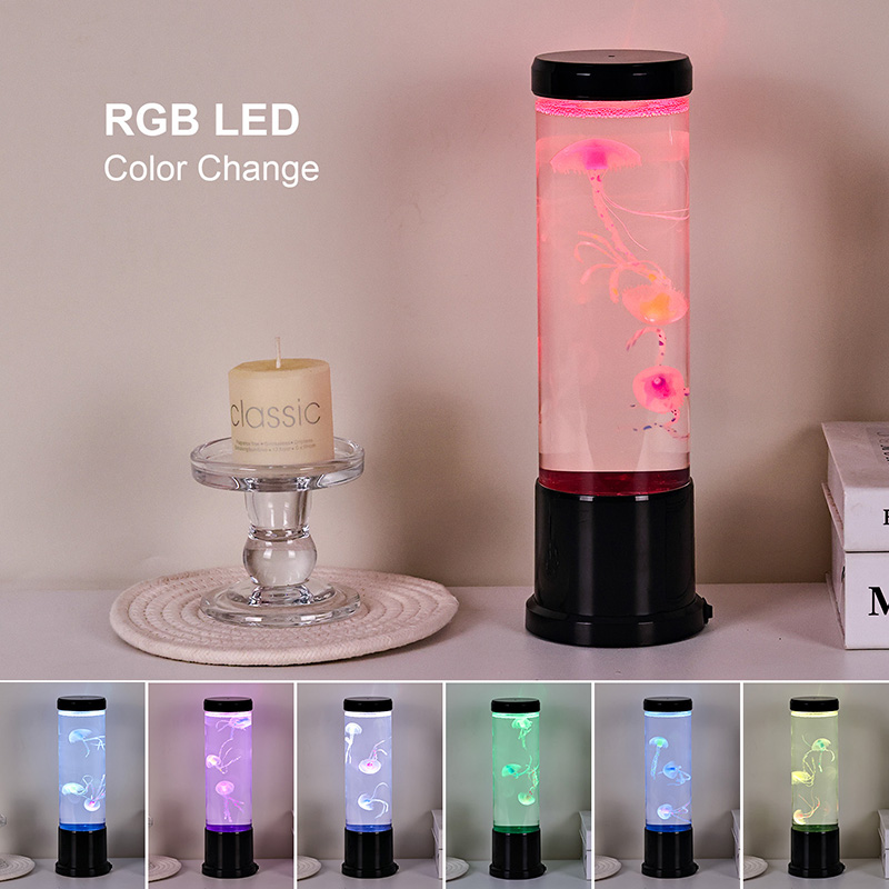 Елегантният дизайн се среща с вдъхновената от природата Светодиодна лампа за медузи с висок размер разполага с висок, тънък цилиндър, изработен от висококачествен прозрачен акрил, който позволява кристално ясна видимост на грациозната медуза вътре. Обвити в мека синя течна среда, три реалистични медузи нежно се носят и пулсират, полупрозрачните им тела са осветени от динамични, многоцветни LED светлини. Нежното сияние преминава през спектър от успокояващи нюанси - от дълбоки океански сини и лилави до меки розови и зелени - имитирайки биолуминесценцията, открита в истинска дълбоководна среда. Горната част и основата на лампата са завършени с лъскава черна пластмаса, което й придава модерен, минималистичен вид, който допълва всеки стил на декорация.