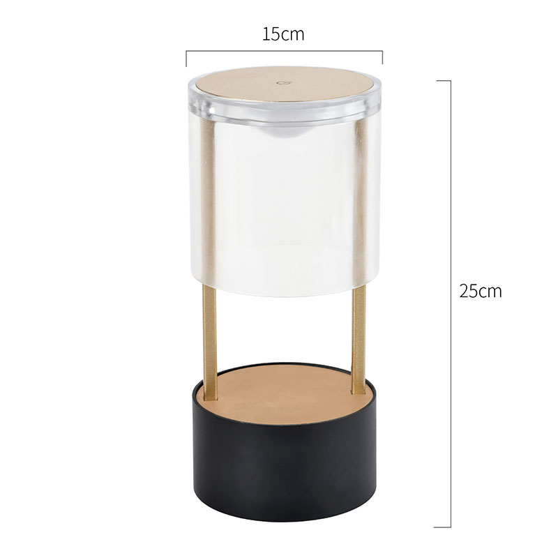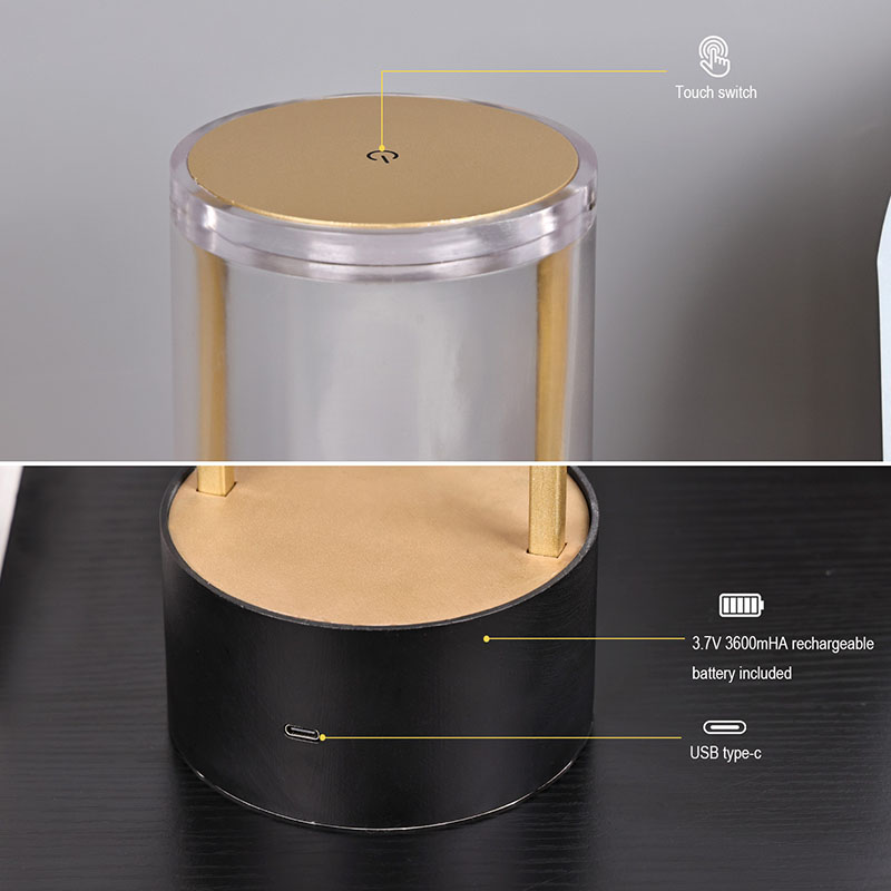 Горната част на малката настолна лампа в стил фенер е чувствителен на допир превключвател за светлина с акумулаторна глава за зареждане тип-c в долната част. Горната част е съставена от прозрачно акрилно покритие, а долната е метална основа. Цялостната кръгла структура позволява подвижно осветление