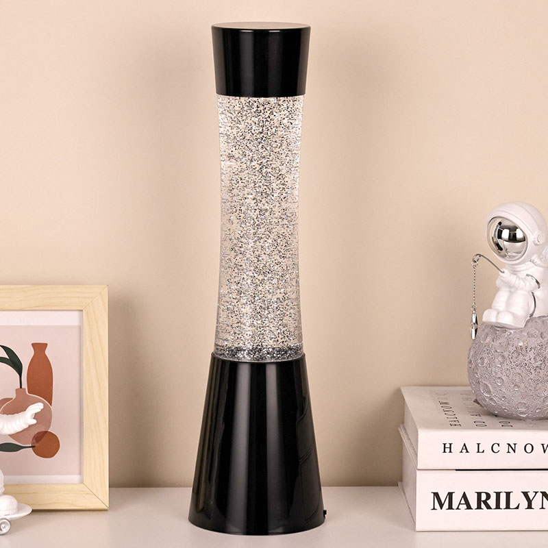 Led glitter лава лампа с батерия 3AAA е изработена от висококачествена пластмаса и метални материали, с добра стабилност и издръжливост. Тялото на пластмасовата бутилка е фино полирано и обработено, което води до гладка и деликатна повърхност с мек блясък. Металната основа придава на лампата стабилна и благородна текстура, което я прави по-стабилна и надеждна по време на употреба.