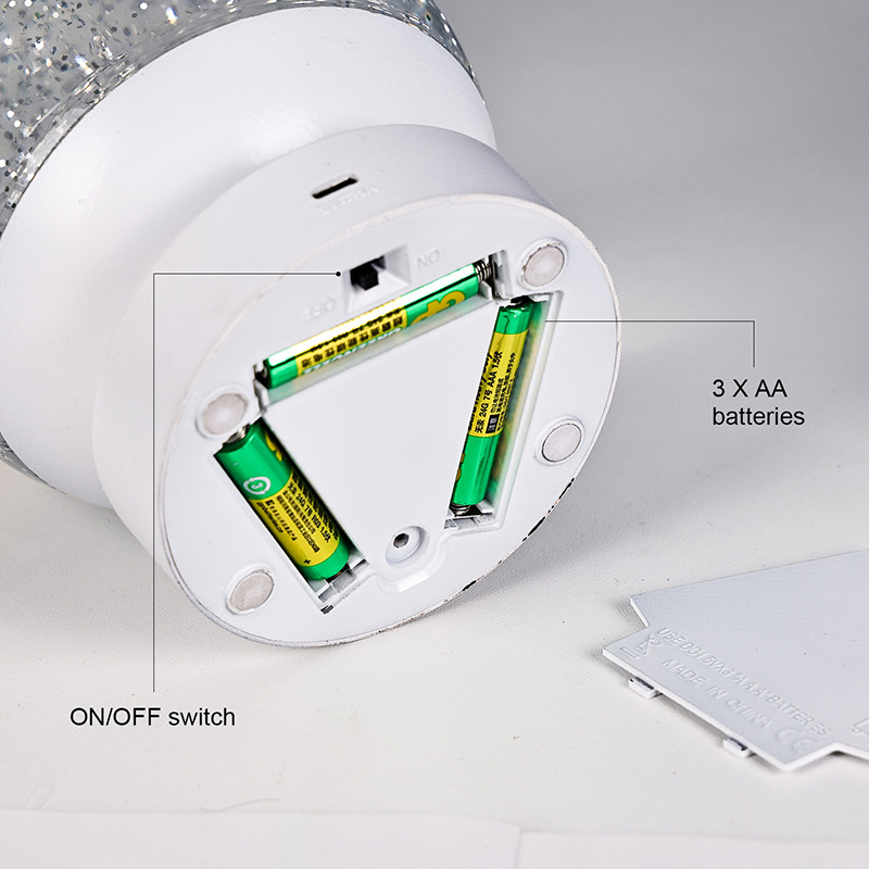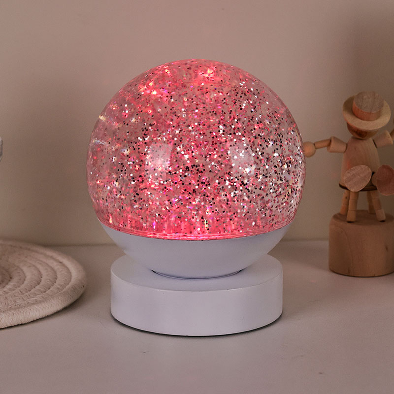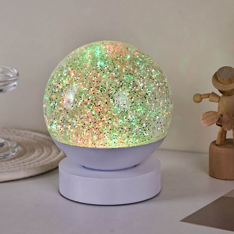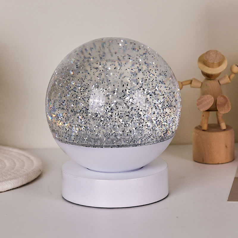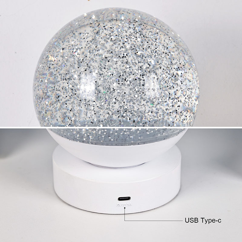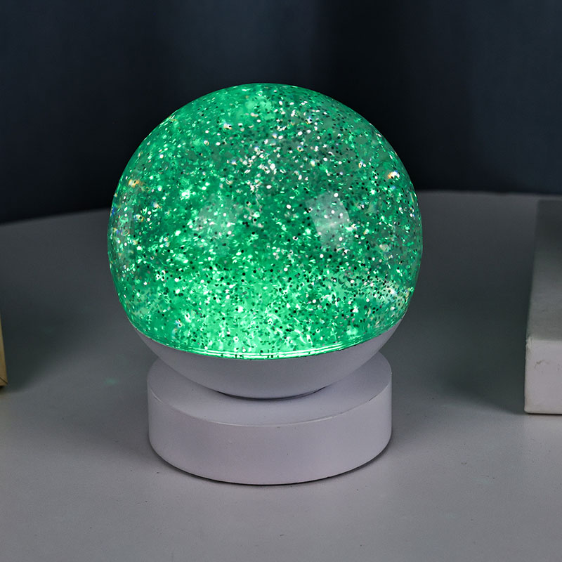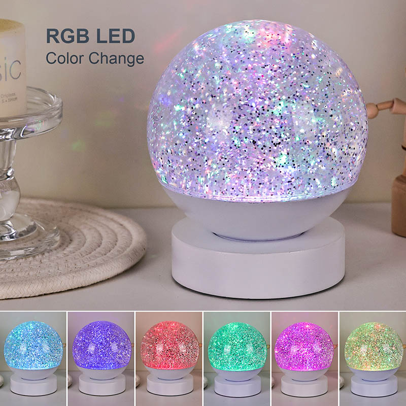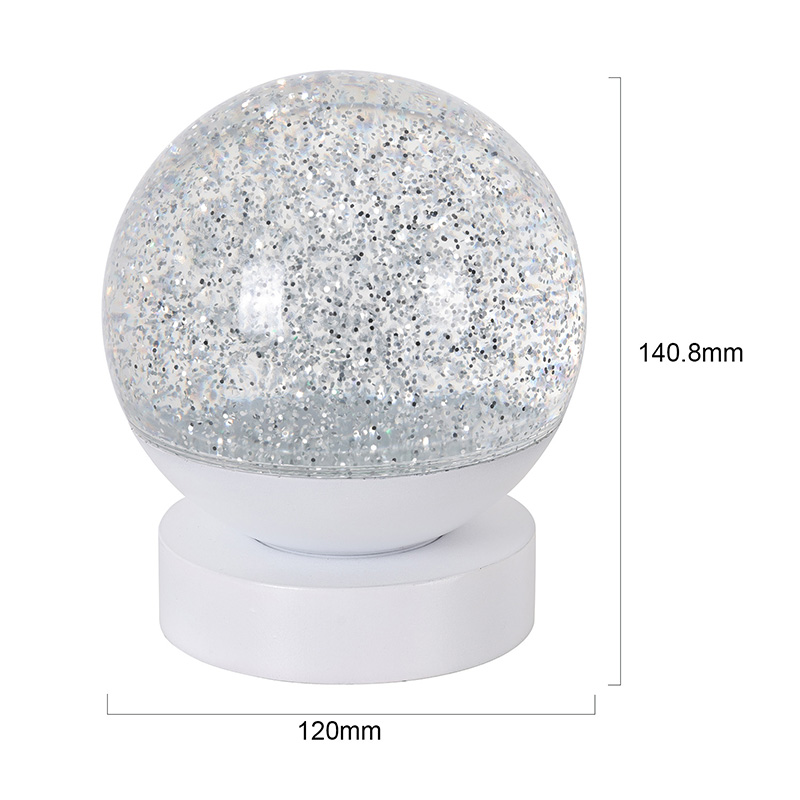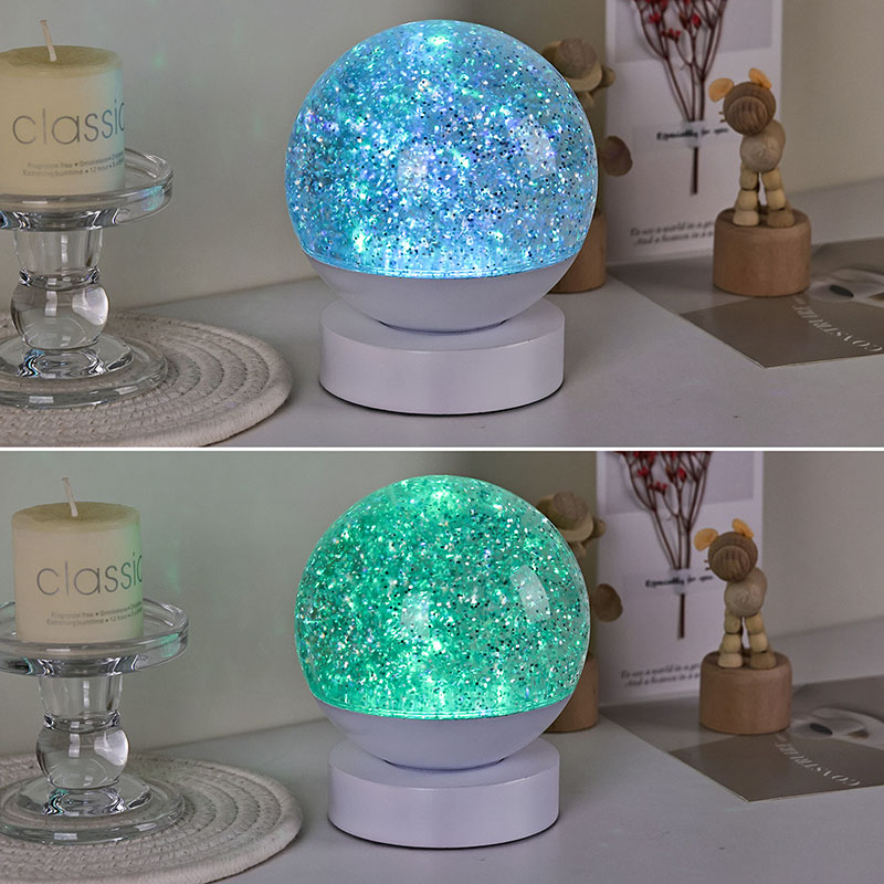 Led RGB Glitter Decor Lamp е изработена от висококачествен акрилен материал, включващ полупрозрачна сфера с отлично пропускане на светлина. Основата е изработена от екологична ABS пластмаса, осигуряваща стабилност, издръжливост и безопасност без токсични вещества. Работи с три вградени AAA батерии (батериите се продават отделно), елиминирайки нуждата от електрически контакт и предлагайки удобна употреба. Перфектен за поставяне до леглото, бюрото или в детски кът с играчки. С обикновен сензорен превключвател светлината може лесно да се включва или изключва, което я прави лесна за употреба дори за деца да работят самостоятелно.