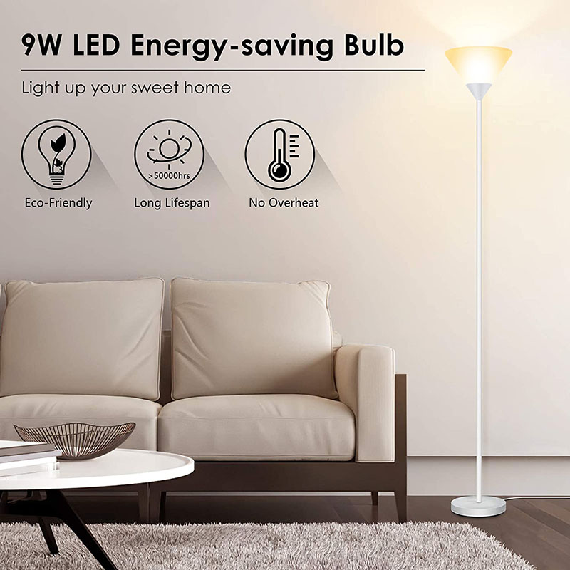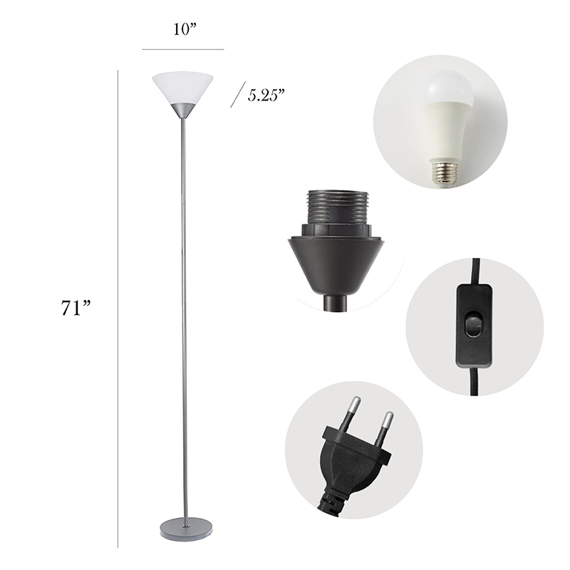 Изработена от висококачествени материали, универсалната LED подова лампа разполага със здрава метална рамка и издръжлив пластмасов абажур. Неговият минималистичен дизайн гарантира, че се вписва безпроблемно във всеки интериорен декор, независимо дали е модерен, традиционен или еклектичен. Еднопръчковата структура на лампата осигурява стабилност и изчистена естетика, докато коничният абажур насочва светлината нагоре, създавайки уютна атмосфера.