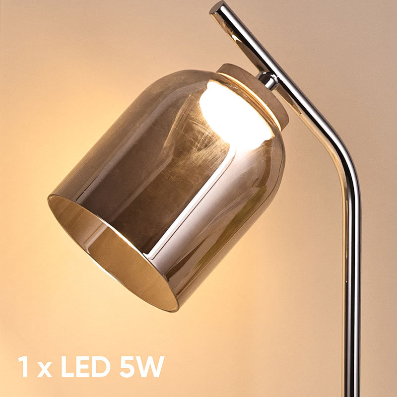 Хромирана основа, опушено (кехлибарено) стъклоИновативен дизайн, стъклен материал, висок клас и елегантен външен вид, изключително декоративен стил на дизайн на настолна лампа