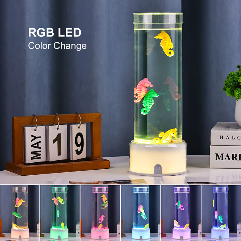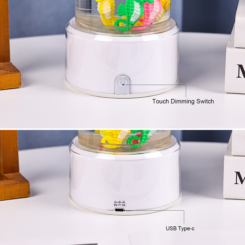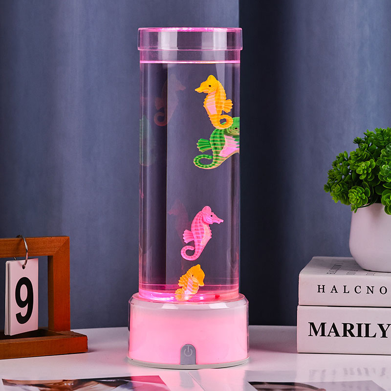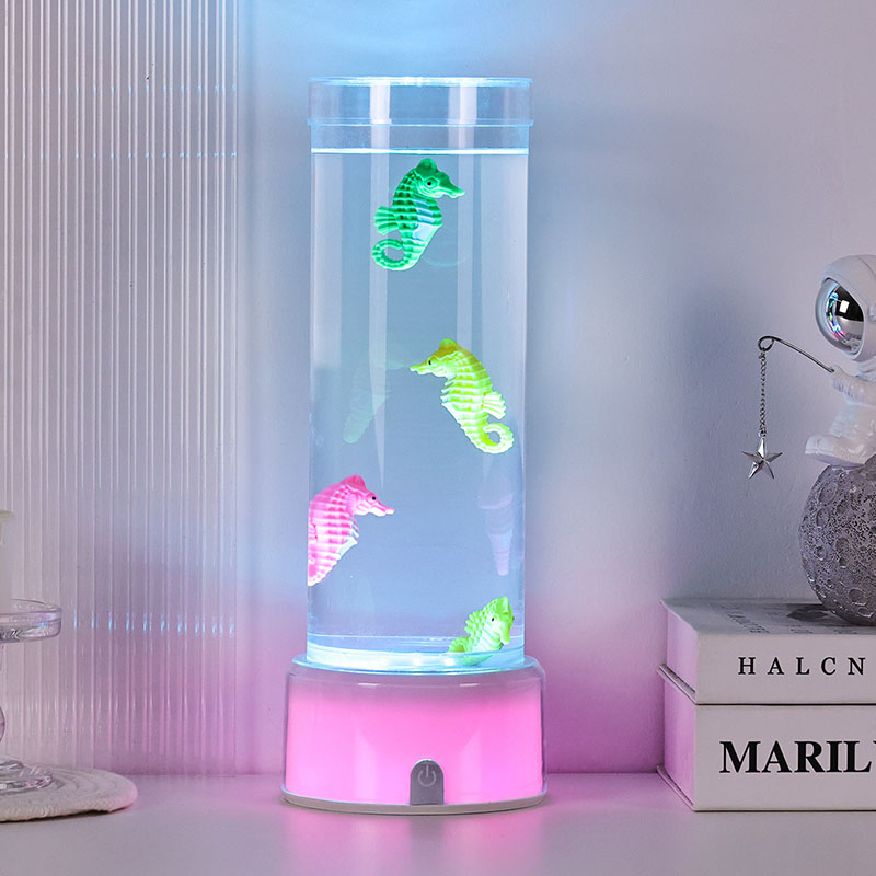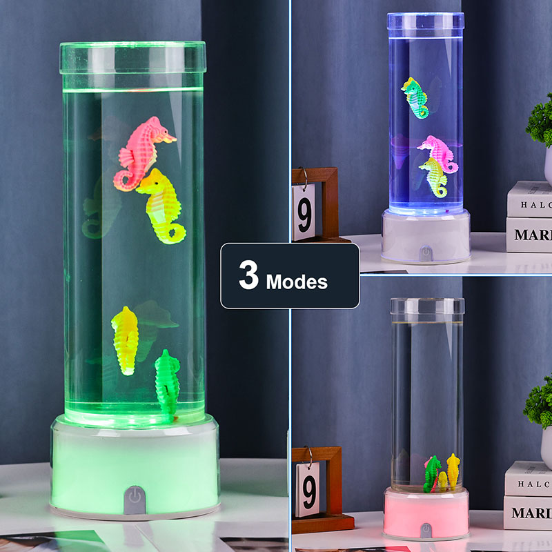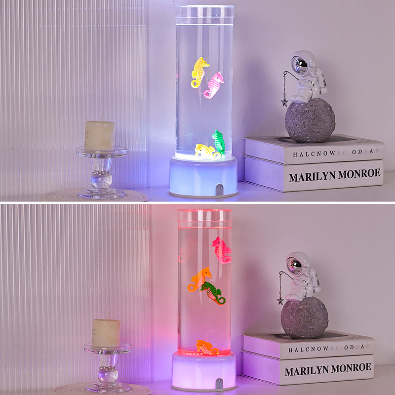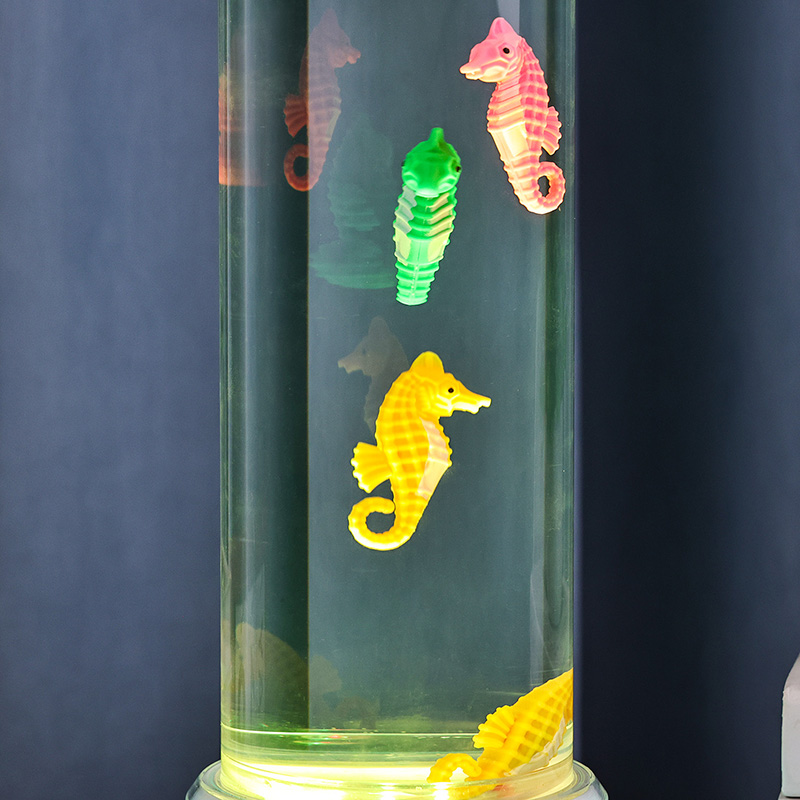 хипнотизираща подводна сцена, която предизвиква спокойствието на океана Целият модул е направен от висококачествена издръжлива пластмаса, осигуряваща стабилност на безопасността и дълготрайна работа Лампата е висока приблизително 12 инча с елегантна прозрачна тръба, пълна с нетоксична течност и цветни орнаменти на морско конче Всяко морско конче е внимателно изработено с внимание към детайла, включващо живи цветове и реалистични текстури Те се носят грациозно в течния стълб задвижван от тиха вътрешна циркулационна система, която създава естествено люлеещо се движение, наподобяващо истински морски живот. Това нежно движение е успокояващо за гледане и помага за намаляване на стреса, като същевременно осигурява успокояващо визуално изживяване