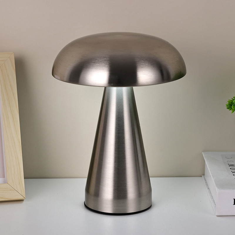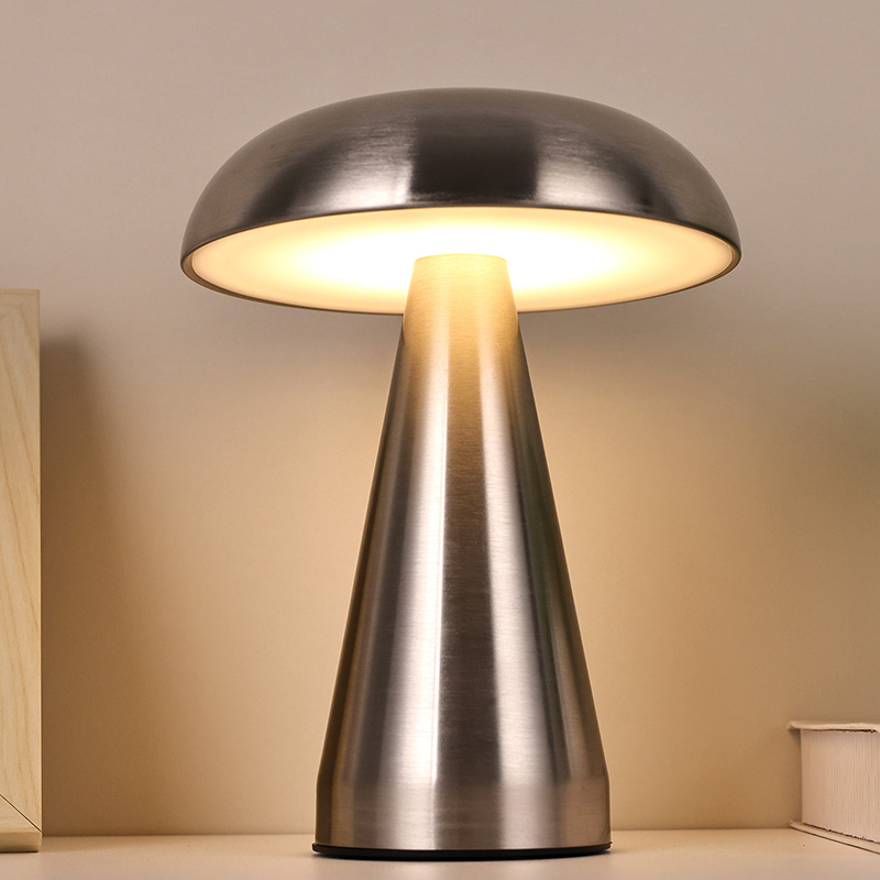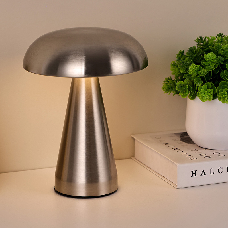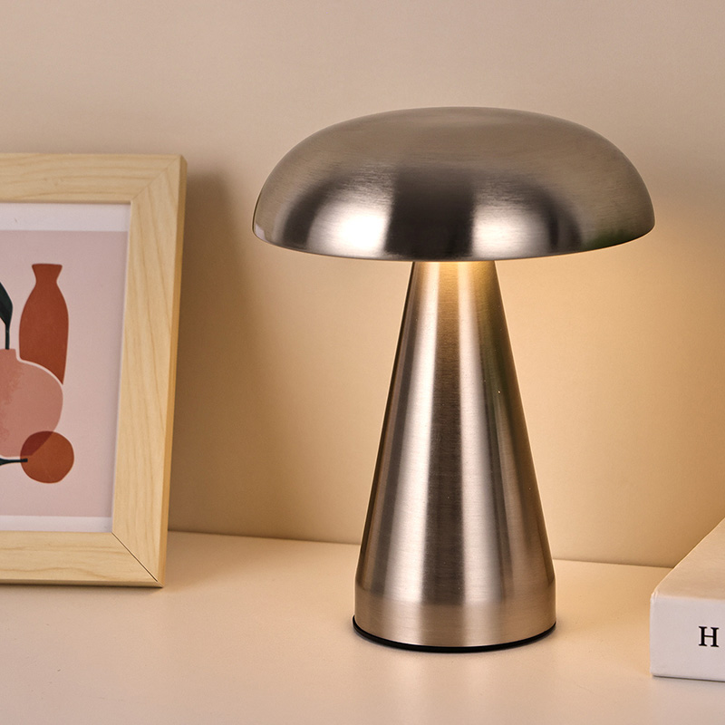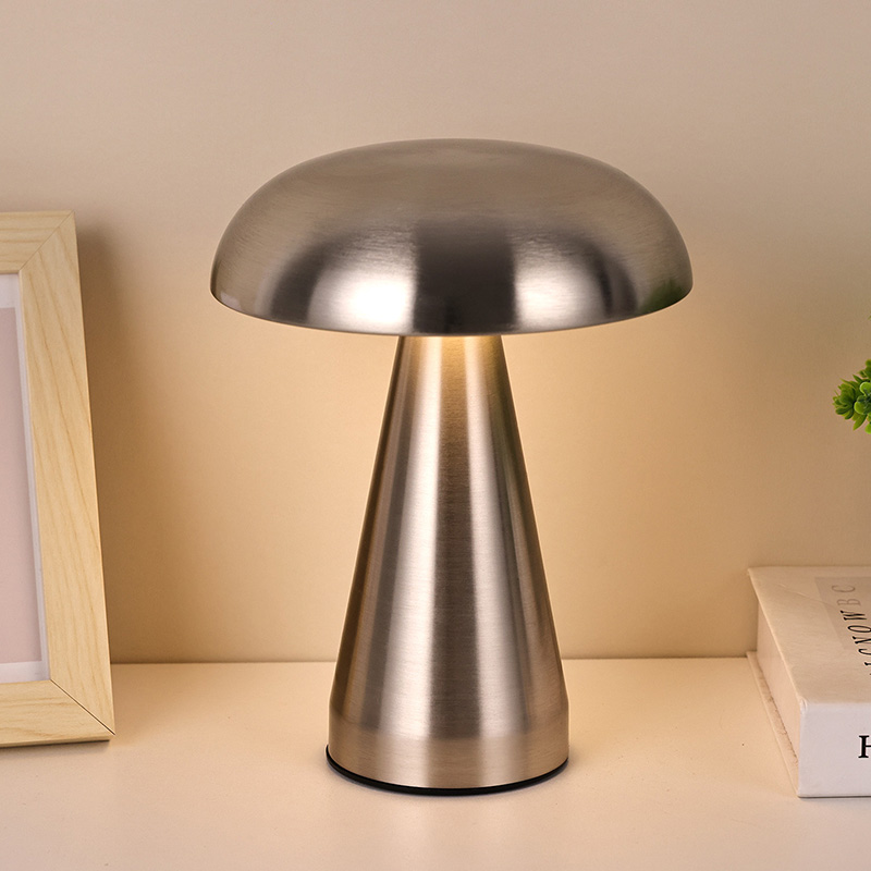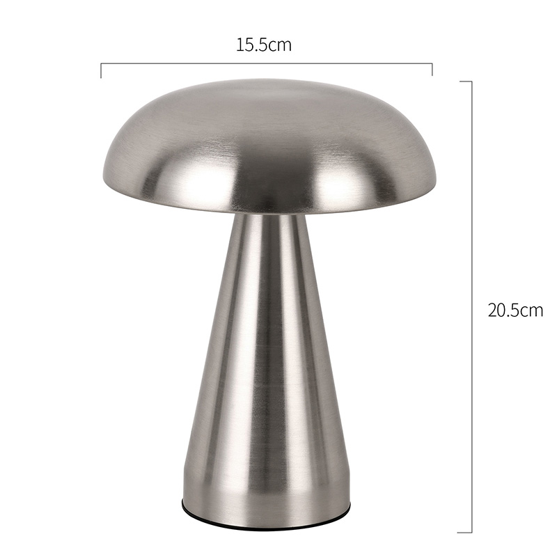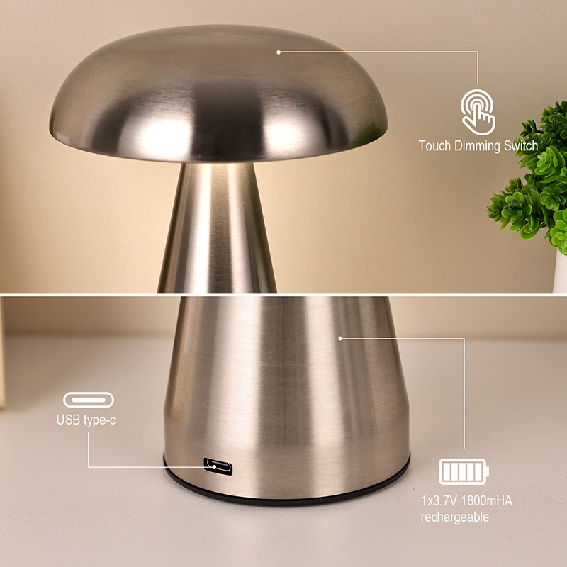 Сензорен превключвател за затъмняванеЦялата метална LED настолна лампа с гъбен абажур е изработена изцяло от метален материал и има много специален дизайн. Имитира формата на гъба и има светлини с регулируема сила, изрязани вътре в гъбата. Цяла метална Led настолна лампа с гъбен абажур е подходяща за поставяне в детски стаи в среда, наподобяваща разговор. Цялата метална Led настолна лампа с гъбен абажур допълва света на децата добре и осигурява топло осветление за стаята. За лесна мобилност, настолната лампа има и вградена акумулаторна батерия, която може да се използва по всяко време и навсякъде